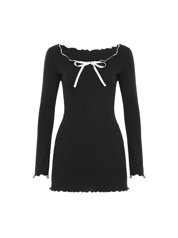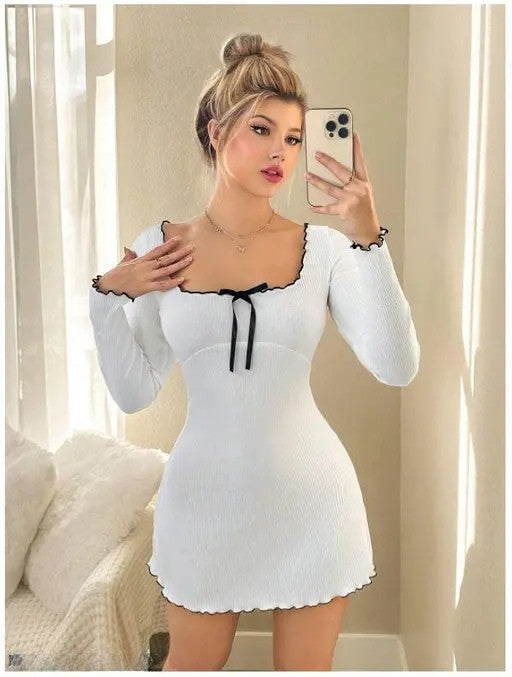 Turn heads effortlessly with the Ethereal Elegance Dress, a perfect blend of sophistication and charm. Designed with a figure-hugging silhouette, soft ribbed fabric, and delicate ruffle details, this dress exudes feminine allure. The chic square neckline with a dainty bow accent adds a romantic touch, while the long sleeves keep it effortlessly classy.